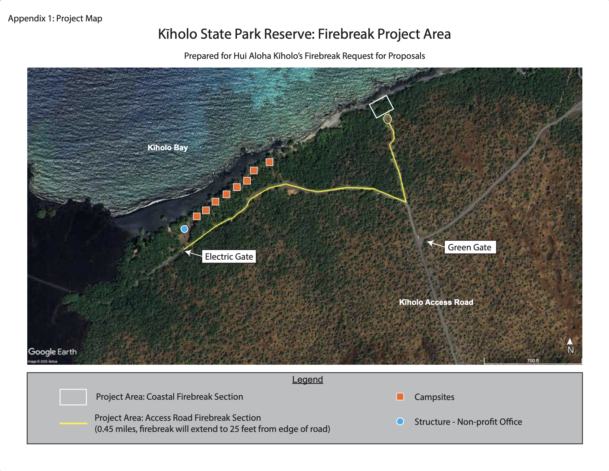 Hui Aloha Kīholo is conducting a wildfire mitigation project at Kīholo State Park Reserve, funded by the Hawaiʻi Wildfire Management Organization (HWMO) and coordinated with Hawaiʻi State Parks. The project involves removing invasive, fire-prone vegetation and creating fire buffers along park access roads to reduce wildfire risk, improve emergency access, and protect culturally significant coastal lands while enhancing safety for the community, visitors, and first responders.